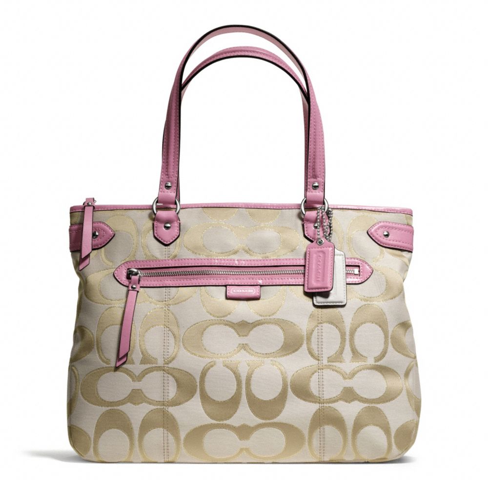 COACH F23938 DAISY OUTLINE SIGNATURE METALLIC EMMA TOTE SILVER/LIGHT-KHAKI/PINK HANDBAGS