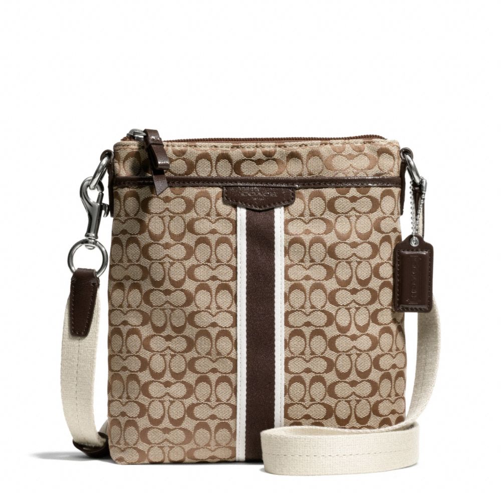 COACH F51163 SIGNATURE STRIPE 6CM NORTH/SOUTH SWINGPACK SILVER/KHAKI/MAHOGANY HANDBAGS