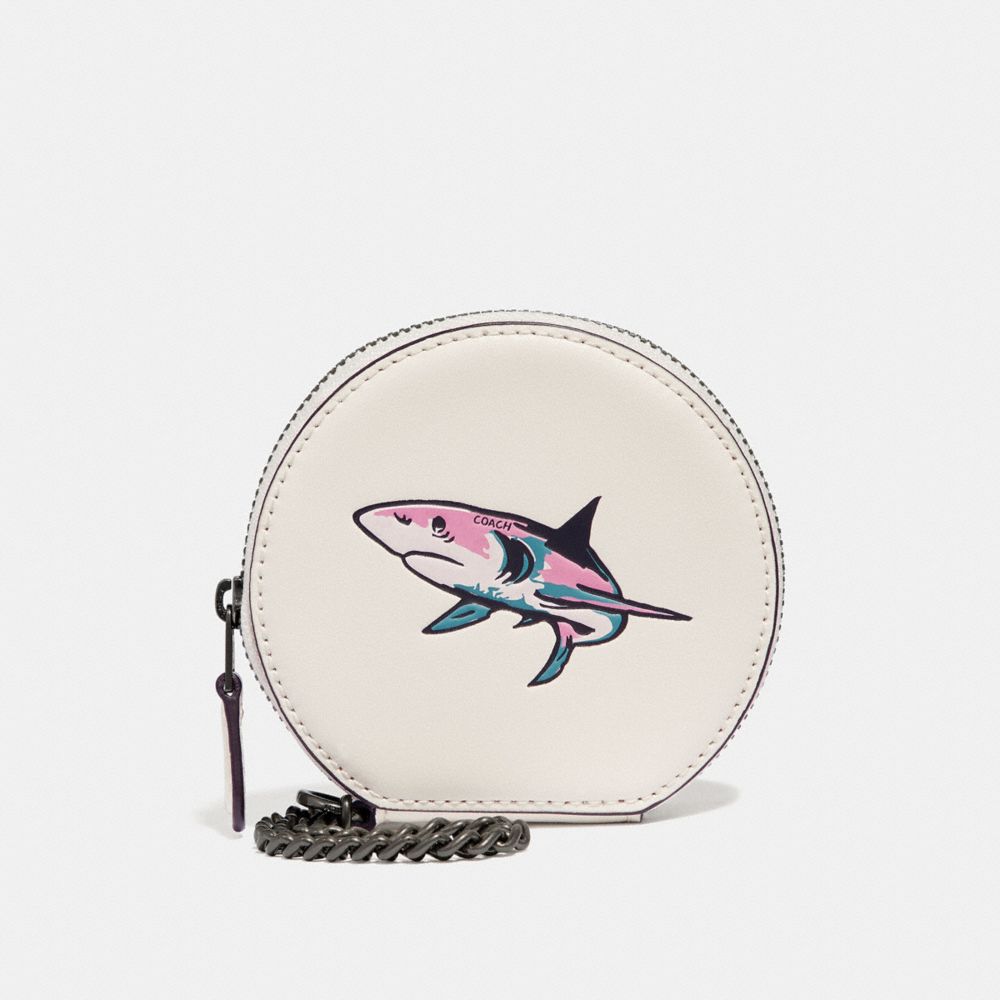 1. COACH f27476 - ROUND COIN CASE WITH SHARK MOTIF - CHALK/BLACK ANTIQUE NICKEL
