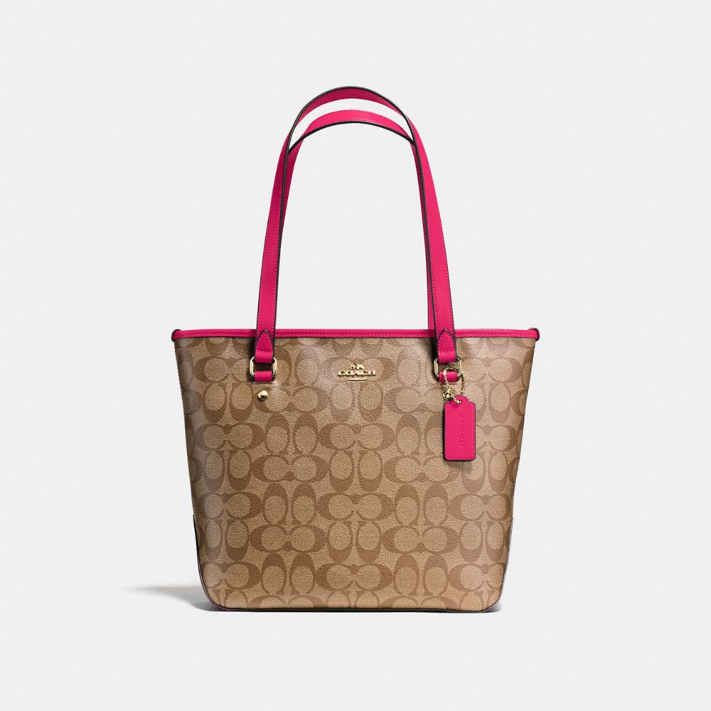 COACH F58294 - ZIP TOP TOTE IN SIGNATURE - IMITATION GOLD/KHAKI BRIGHT PINK (click the link before for more detail)