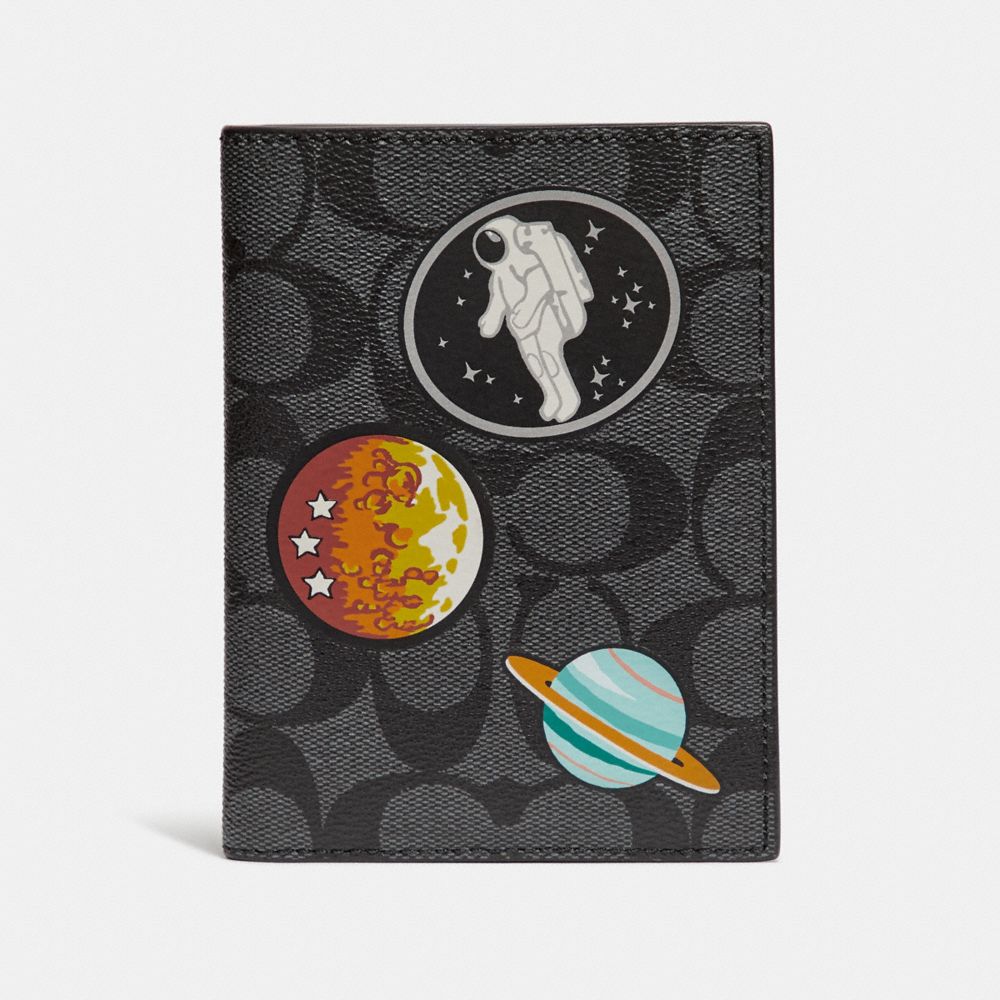 1. COACH f32460 - PASSPORT CASE IN SIGNATURE CANVAS WITH SPACE PATCHES - CHARCOAL/BLACK