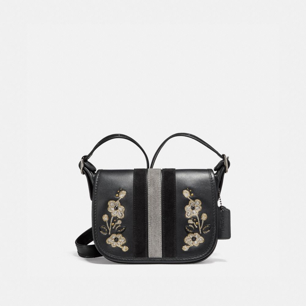 COACH F11911 - PATRICIA SADDLE 18 IN VARSITY STRIPE LEATHER WITH FLORAL EMBROIDERY - ANTIQUE-NICKEL/BLACK - HANDBAGS