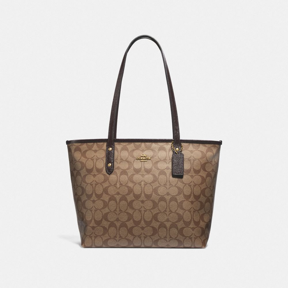 1. COACH F31974 - CITY ZIP TOTE IN SIGNATURE CANVAS - KHAKI/OXBLOOD MULTI/LIGHT GOLD